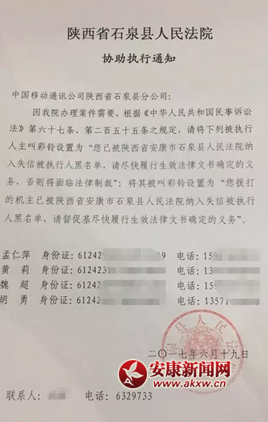 安康新聞網訊(通訊員 尚君)“您撥打的機主已被陜西省安康市石泉縣人民法院納入失信被執行人黑名單,請督促其盡快履行生效法律文書確定的義務”,這樣的彩鈴您從來沒聽過吧!今后,這樣的彩鈴您在生活中或許就會遇到。6月19日,石泉縣人民法院由安康市中級人民法院指定為“通信限制”試點法院,分別與石泉縣移動、電信、聯通三大通信公司協商一致,將通過發送《協助執行通知書》的方式請三大通信公司協助執行,在全省率先對“老賴”實施通信限制。