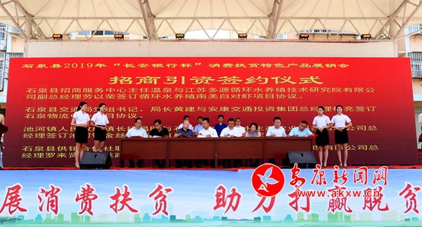 現場還簽訂了循環水養殖南美白對蝦、石泉物流中心、池河鎮金絲皇菊種植及農副產品加工、絲路桑海生態酒店四個招商引資協議。