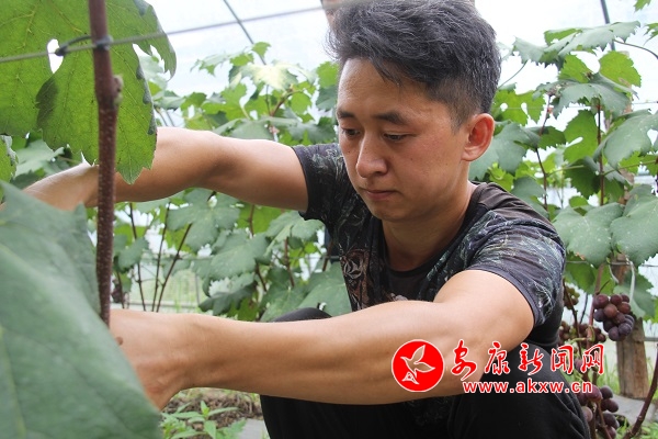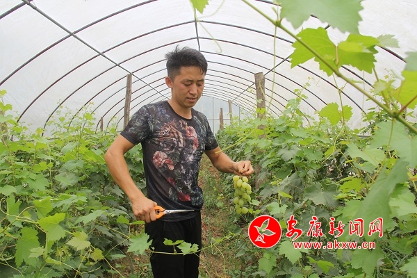 6年前,政府為引導村民發展生態產業種植,提高農業產業收入,下大力投入資金將原先的露天菜地建成了生態產業園連片設施大棚。但很多本地村民因為不懂農業科技,不懂農業產業市場,對建好的設施大棚望而卻步。譚文軍是第一個到產業園租賃設施大棚栽種葡萄的外村人。當年,他引進了戶太8號品種1萬余株,栽種30畝60個大棚。從2016年開始,這批葡萄進入采摘期,從剛開始的畝產2000斤,到現在畝產3000斤,譚文軍說,明年進入豐產期,畝產還將提高到4500斤左右。
