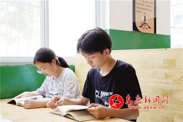 馬英琦(右)在石泉中學(xué)圖書(shū)館看書(shū)