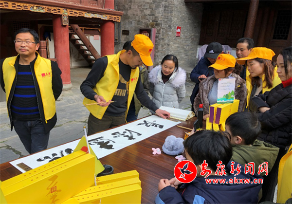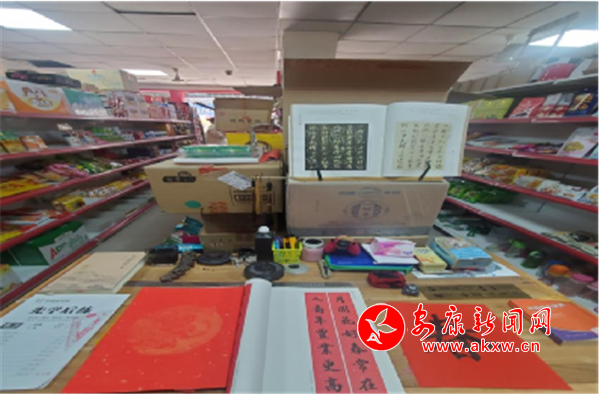 走進店里,除了琳瑯滿目的商品外,貨架旁還放置了一張桌子,那是沈古頂日常練習書法的地方。他每天都會抽出兩到三小時練字,從不落下一天。常有老顧客向他求墨寶,他總是欣然答應,為顧客認真寫好每幅字。近年,縣煙草公司在商戶中成立了誠信經營互助組織,沈古頂的“字謎”隊伍更加壯大了。他不但用書法為自己筑就了一方桃花源,也在大家之間架起了一座促進交流、建立友誼的連心橋。