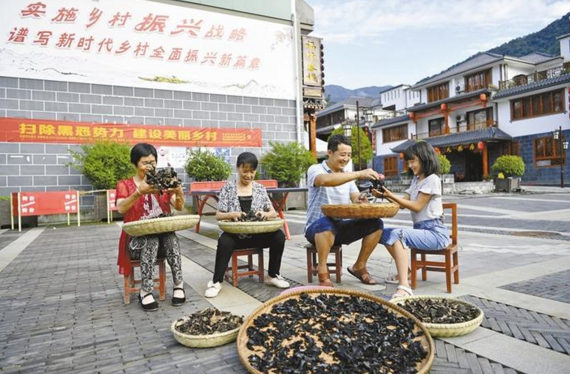 (七月三十一日, 在鎮(zhèn)坪縣聯(lián)合村的巴山臘味小鎮(zhèn),村民楊大兵(右二)與家人正在清洗巖耳。巴山臘味小鎮(zhèn)是陜西省十二個(gè)農(nóng)村特色產(chǎn)業(yè)小鎮(zhèn)之一,每年吸引不少省內(nèi)外……