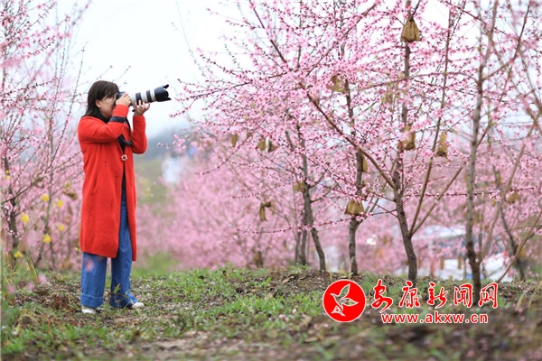 游客們穿梭在桃林間賞花拍照,攝影愛好者們拿起手中的相機,以專業的攝影技巧、獨特的視角和充滿靈感的鏡頭,定格桃園的美景。