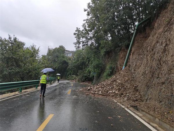 轄區S310省道有部分路段出現塌方、落石。51KM—53KM處有團霧;蒿漢路目前部分路段有垮方、落石,轄區其他各條道路均有積水、垮塌、泥石流造成通行受阻。