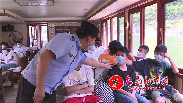 上午10點,學生們排著整齊的隊伍,戴著口罩、背著書包,陸續登船。紫陽縣交通運輸綜合執法大隊水運中隊中隊長楊超和其他工作人員、船舶安全員一起,分別站在船頭和岸邊,引導學生,保障安全。