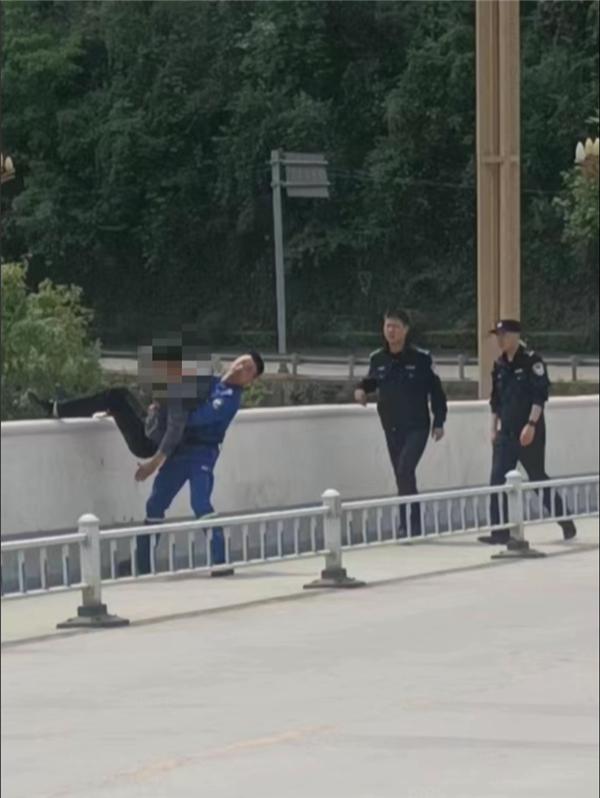 在吳勇抱住輕生男子的瞬間,身后的民警和群眾也立即沖上前幫忙,合力將該男子救援至護(hù)欄內(nèi)的人行道上,成功挽救了一條生命,化解了一個(gè)家庭的悲劇。救援結(jié)束后,男子被民警帶回城關(guān)派出所進(jìn)行耐心安撫與勸解,目前,該男子情緒已逐漸平穩(wěn)。