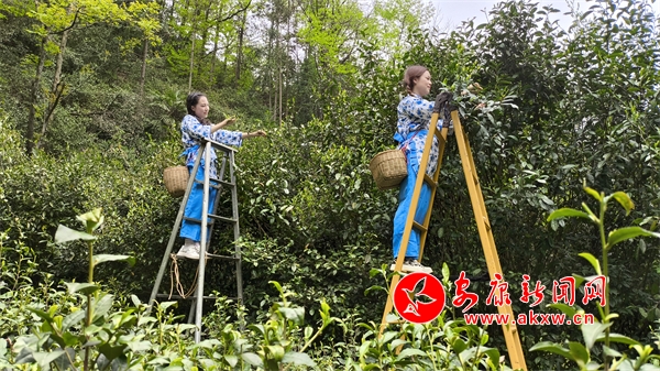 4月28日,安康市紫陽縣雙橋鎮蓮花村村民正搭著梯子,采摘古茶樹鮮葉。通訊員 儲茂銀攝
