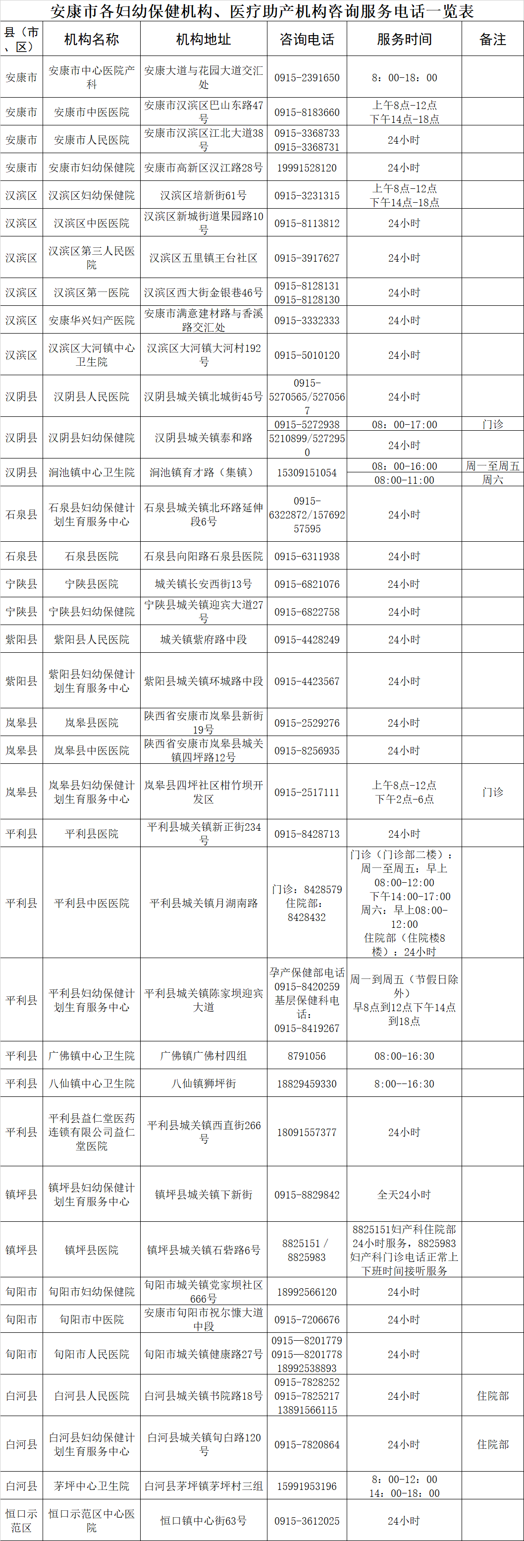 附件:安康市各婦幼保健機構(gòu)、醫(yī)療助產(chǎn)機構(gòu)咨詢服務(wù)電話一覽表HW6安康新聞網(wǎng)