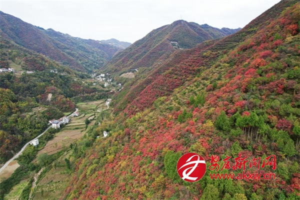 初冬時節,地處秦嶺南麓的漢濱區早陽鎮境內,滿山的紅葉把山村裝扮得美如一幅畫,引得眾多游客和市民來這里賞紅葉、觀美景,盡享生態之美。圖為無人機視角下的早陽紅葉美景。 (通訊員 周濤) Kmu安康新聞網